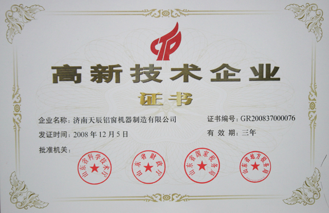 ??? 濟(jì)南高新區(qū)管委會(huì)召開了高新區(qū)2008年首批高新技術(shù)企業(yè)授牌大會(huì),并轉(zhuǎn)發(fā)了省科技廳、財(cái)政廳、省國稅局、省地稅局的認(rèn)定的通知,向區(qū)內(nèi)首批高新技術(shù)企業(yè)頒發(fā)了高新技術(shù)企業(yè)證書和銅牌。天辰鋁機(jī)公司被認(rèn)定位山東省2008年第一批高新技術(shù)企業(yè)。