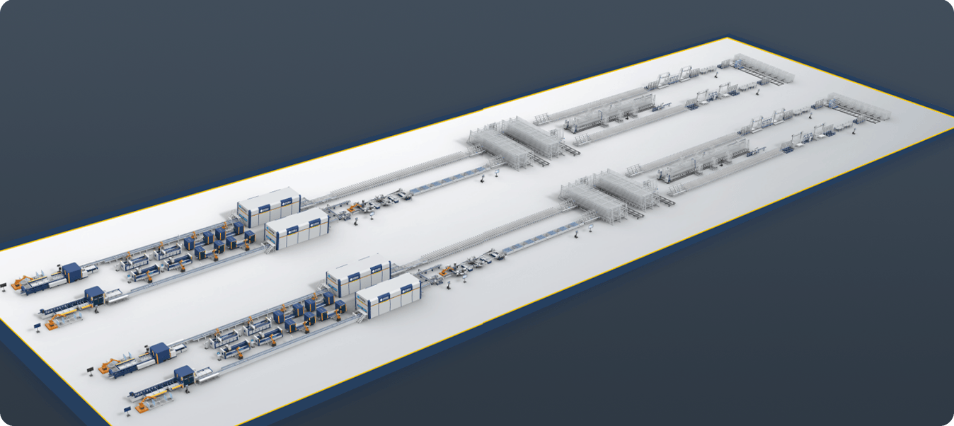 門窗智能化生產(chǎn)線實現(xiàn)對門窗整個生產(chǎn)過程的全面管控,設(shè)備均可接入智能線 MES 中控系統(tǒng)進行統(tǒng)一管理調(diào)度。