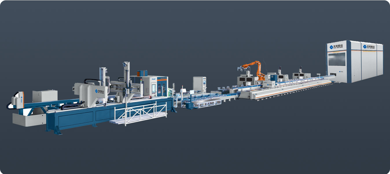 行業(yè)領(lǐng)先的幕墻智能生產(chǎn)線,可完成幕墻公母立柱、橫梁、裝飾線條等多種型材的智能鋸銑加工。在天辰 MES 中控系統(tǒng)的精準管控下,實現(xiàn)自動上料、智能鋸銑、自動分揀、機器人柔性搬運、加工中心智能鉆銑、全自動下料碼垛。